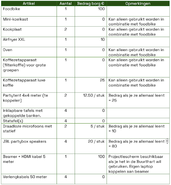 Hieronder vindt u een overzicht van de items die u kunt lenen en de borgkosten: