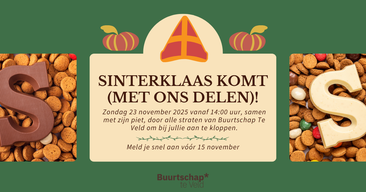 Op zondag 23 november 2025 loopt Sinterklaas vanaf 14:00 uur, samen met zijn piet, door alle straten van Buurtschap Te Veld om bij jullie aan te kloppen. Alle kinderen en kleinkinderen uit de buurt kunnen zich hiervoor aanmelden. Willen jullie dat Sinterklaas bij jullie een cadeautje brengt?